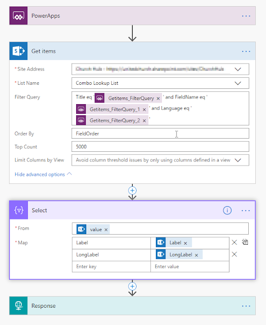 Here, I use a similar flow that filters the list based on the app, list field, and preferred language and sorts the results based on the FieldOrder