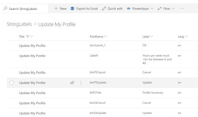 Loading of the strings from SharePoint into the app can be done by either loading the entire SharePoint list and then filtering the values during run-time or using a flow to filter out the specific labels required and returning those to the Power App. When the list of items gets long, as in the case of defining labels for an entire organization, loading and filtering the entire list within the app may have an implication on performance. This is why I elected to go with the latter method. In the expression shown above, I have a flow called Get String Labels to which I pass the name of the label group (e.g. Update My Profile) and the language. The Flow then filters the list on these two columns and returns all relevant items