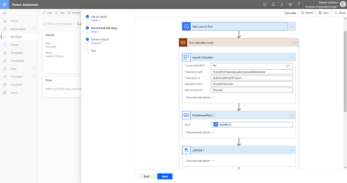 For desktop applications, the user defines a set of actions and provides sample data. When the user actions are recorded, the inputs defined earlier can be used to make the UI flows more dynamic. UI flows can receive inputs from a flow and pass information back to them making the whole end-to-end workflow process much more powerful.