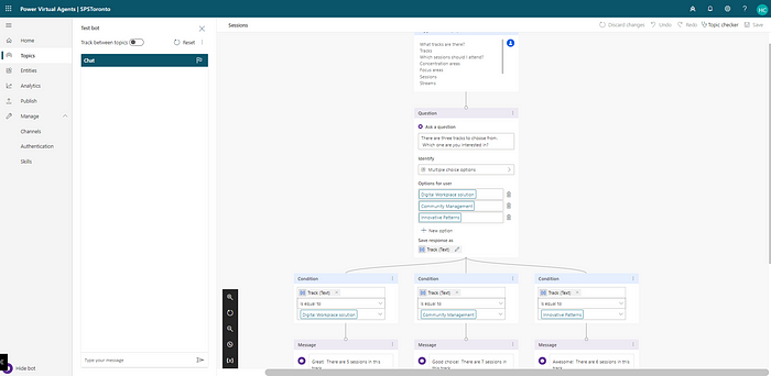 In the authoring canvas, users are able to create workflows that resemble the Power Automate flows in structure. The trigger is always a phrase entered by the user. Downstream from the trigger are actions that are performed either by the bot or the user. Virtual agents are very extensible by being able to call other virtual agents and flows. While in the user interface, the Virtual Agent builder can interact with the bot on the left-hand side of the screen. When interacting with it, the agent accesses all the topics in an attempt to provide the most accurate answer.