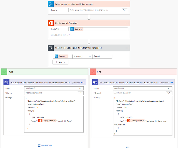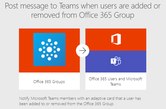 With the new Post message to Teams when users are added or removed from Office 365 Group template, you can design your own adaptive card and share a variety of information for the new user. The trigger is actually on the Office 365 Group that is connected to the Team, not the Team itself. The message appearing when someone joins or leaves can be different.