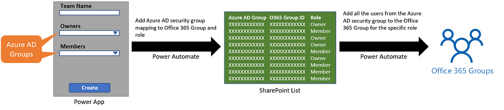 When an Office 365 Group is created, the wizard allows the user to select individual owners and members. For Teams, the creator can pick Azure AD groups, which are then expand to the individual users. In this approach, I recommend using a Power App for capturing the Team/Group creation information. For Owners and Members, rather than getting just individual user email, the app would allow the creator to select Azure AD groups as well. When the information is submitted, a Power Automate flow will take the information provided and perform 2 tasks: