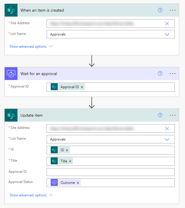 Once the approval has been initiated and the Approval ID is known, it can be used to wait for the approval. For simplicity, I’m using a workflow that is triggered by the SharePoint item creation itself (step 3).