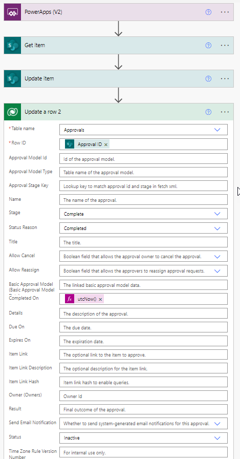 As mentioned in step 4, another workflow is needed to capture the approval outside of the Power Automate workflow, and cancel the request itself to avoid duplication of approvals. Internally, approval data is stored inside Dataverse in the Approvals table. By knowing the Row ID (Approval ID), the status of the approval can be changed without directly interacting with the approval request. Therefore, in this workflow, it is important to not only mark the approval status in the SharePoint list, but also use the Dataverse Update a row action to change the Stage, Status Reason, and Status of the approval request.